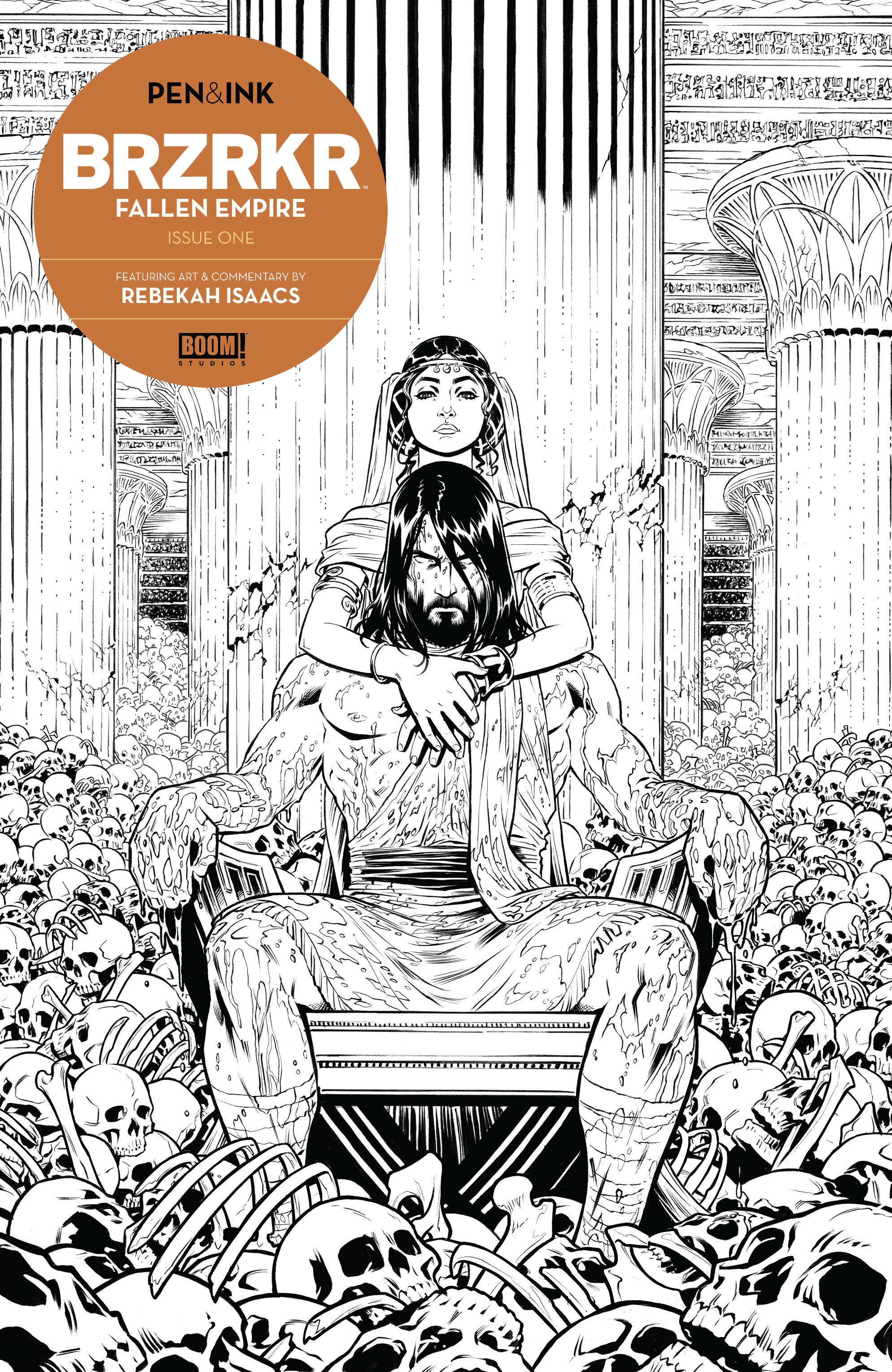 A special pen & ink edition of BRZRKR: Fallen Empire by Mattson Tomlin and Rebekah Isaacs, in a premium format with additional commentary by the artist! The lone survivor of Olos, a long-dead empire that once thrived, tells a tale of B.’s distant past, and the death and cataclysm he brought forth. But what else did B. find that could have driven him to such violence? The heart is as much a weapon as any in B.’s arsenal...